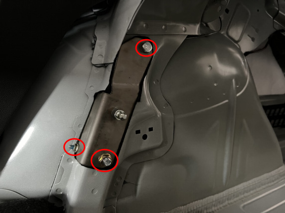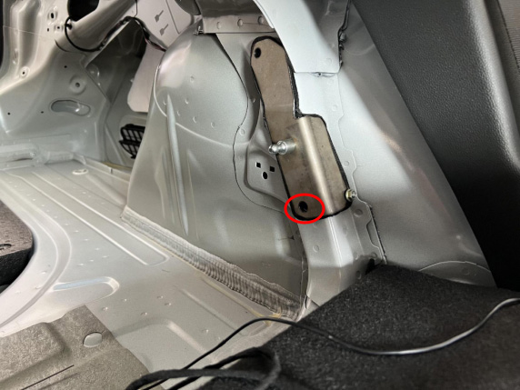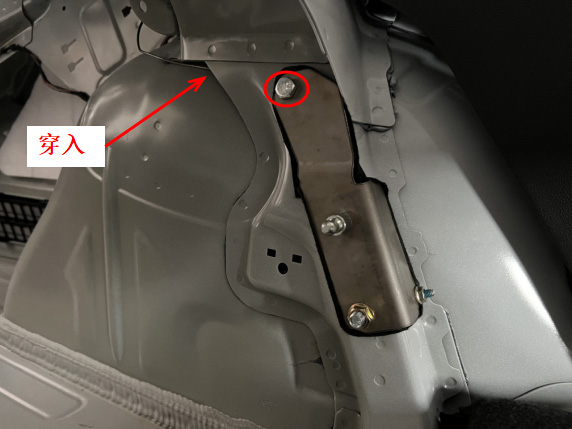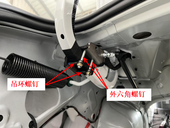 12、安装尾门左支架,将支架定位柱穿入原车线扣孔,按图示位置固定好外六角螺钉与吊环螺钉。