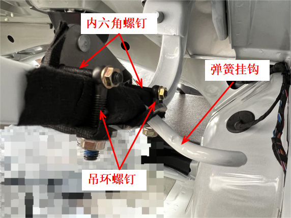 13、将支架上的定位孔穿入弹簧挂钩,按图示位置上好内六角螺钉与吊环螺钉。