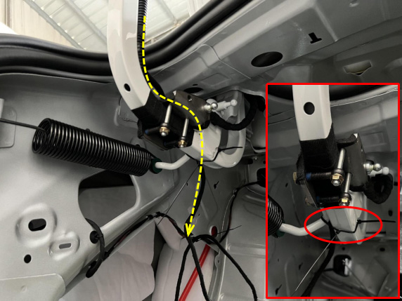 20、在弹簧挂钩处按图示绑好锁信号线,注意在摆臂下方预留一定长度,防止夹线。
