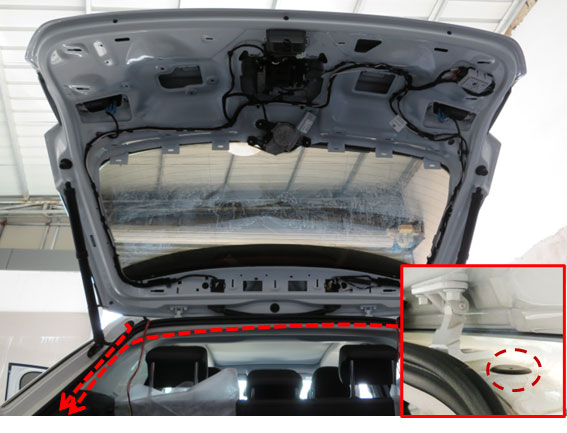 17、如图示,将尾门铰链处的胶塞取出,布撑杆线到尾箱左侧。
